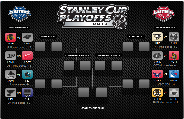 Wow the first round off the 2013 NHL Playoffs has been an emotional roller-coaster for hockey fans. Fans of the Canucks saw their beloved Canucks swept by the San Jose Sharks in four games marking the first time that the San Jose Sharks have swept a playoff series. Fans of the Toronto Maple Leafs experienced bitter defeat as the Leafs had a 4-1 lead vs. the Boston Bruins late in the third period of game seven only to see the Bruins score three to tie it up, the tying goal coming with under a minute left to play and then win it nearly seven minutes of overtime. Ouch. Then you have those #peskySens who pulled a minor upset of the Montreal Canadiens in five games and the defending Stanley Cup champion Los Angeles Kings who won four straight to knock of the St. Louis Blues in six games. It has been an up and down playoff for hockey fans depending on which team or teams that you are rooting for.