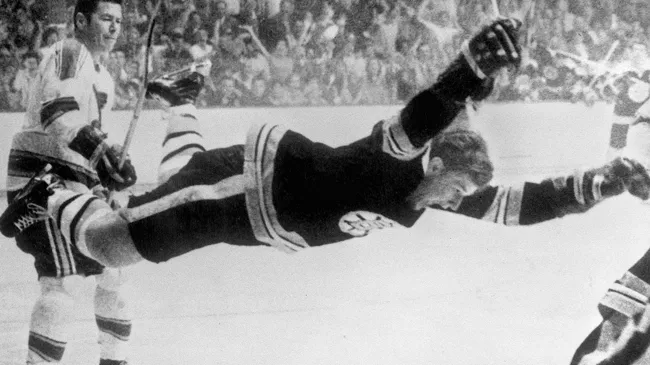Booby Orr Flying through the air after scoring in OT vs. St. Louis